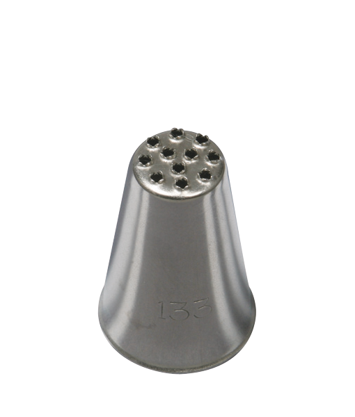 Закрытая конусовидная насадка с небольшими отверстиями на конце. С помощью Травки кондитеры создают рельеф для тортов и пирожных, визуально напоминающий луг с настоящей травой. Также этот тип насадки можно использовать при необходимости сымитировать шерсть животного.